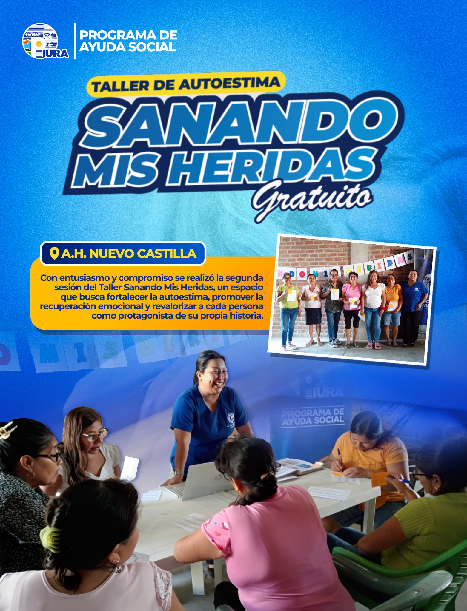 El Gobierno Regional Piura, a través del Programa de Ayuda Social, llevo a cabo el taller de autoestima "Sanando mis Heridas" en el A.H Nuevo Castilla. Este taller tiene como objetivo fortalecer la autoestima, promover la recuperación emocional y revalorizar a cada persona como protagonista de su propia historia.El taller es completamente gratuito, lo que permite que más personas puedan acceder a este recurso valioso para mejorar su bienestar emocional y psicológico. El Gobierno Regional Piura reafirma su compromiso con la salud mental y el bienestar de la población a través de estos talleres.