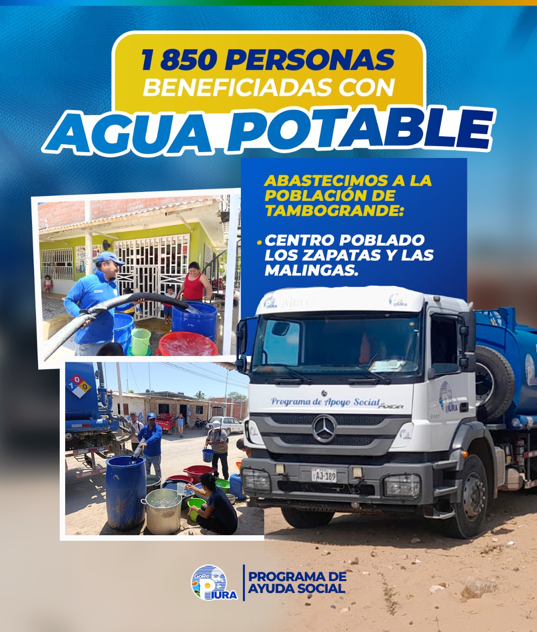 El Programa de Ayuda Social (PAS) del Gobierno Regional Piura realizó una importante intervención en beneficio de las familias de los centros poblados Los Zapatas y Las Malingas, pertenecientes al distrito de Tambogrande, mediante la entrega de 10,000 galones de agua potable, asegurando el acceso temporal al recurso a 1,850 personas.Esta acción se llevó a cabo con el objetivo de atender la necesidad urgente de abastecimiento de agua en estas comunidades, reafirmando el compromiso del Gobierno Regional de Piura de brindar apoyo oportuno y solidario a las zonas que enfrentan limitaciones en el acceso a servicios básicos.El equipo del PAS destacó que estas entregas forman parte de las intervenciones humanitarias que se desarrollan en toda la región, priorizando a las poblaciones más vulnerables y contribuyendo a mejorar su calidad de vida.Con estas acciones, el Gobierno Regional de Piura continúa fortaleciendo su labor social y su cercanía con la población, llevando ayuda directa a quienes más lo necesitan.